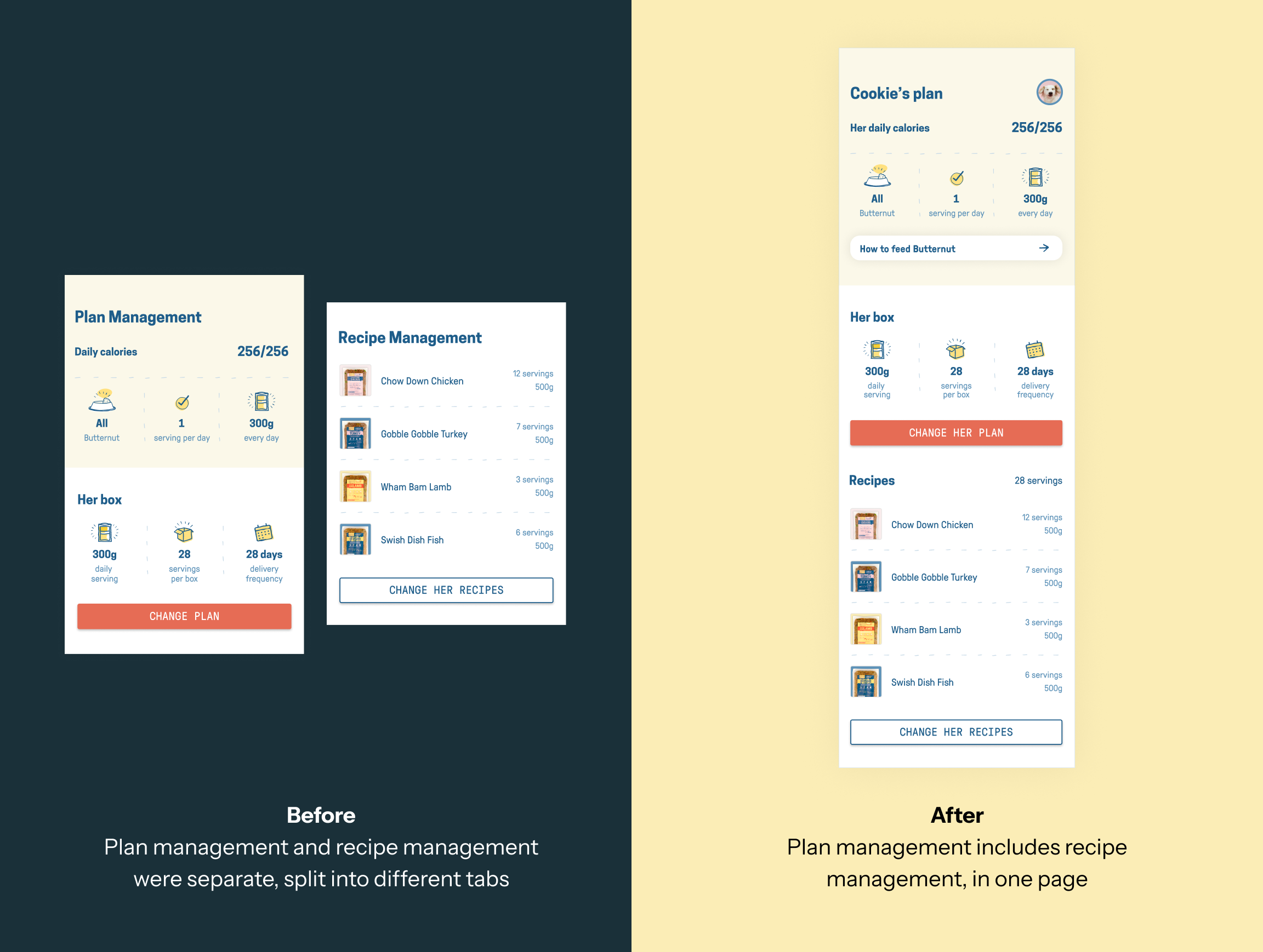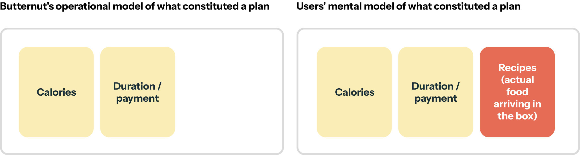 There was a disconnect between Butternut’s operational model and users’ mental model. Butternut saw the recipes as separate from the plan itself, while users expected the entire box, including recipes, to be part of the plan. This led to confusion because users looked for recipe changes under "Plan Management," while the recipes were presented under “Recipe Management”. Finding things users wanted became difficult and led to frustration.