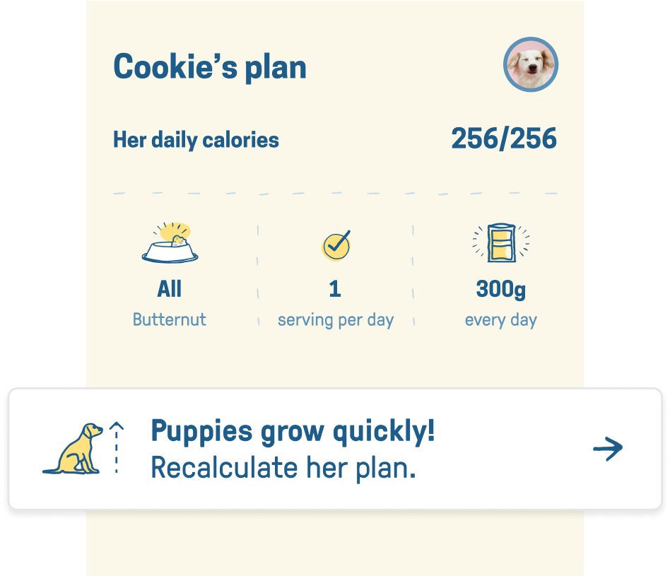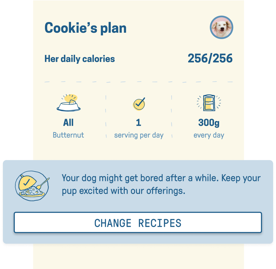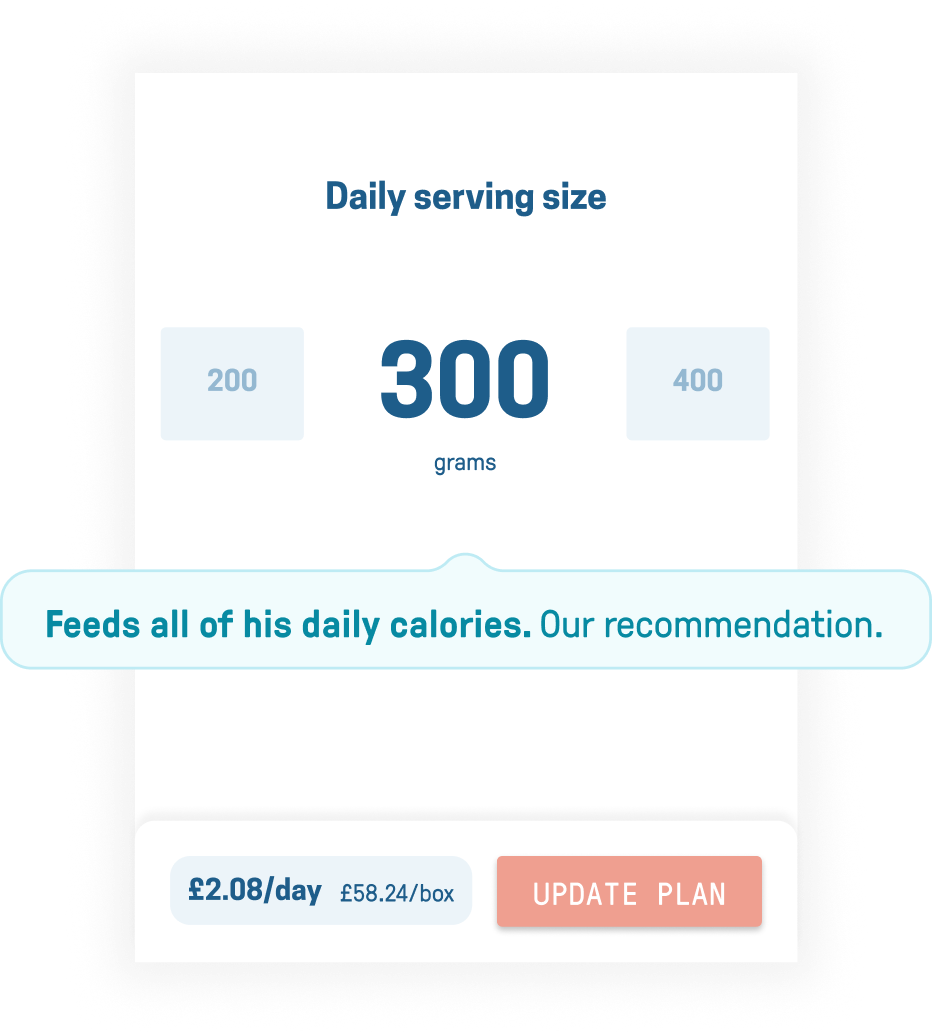 Users can customise the daily serving size, but if Butternut feels that this does not match the calories the dog requires, the user will be provided with immediate feedback.